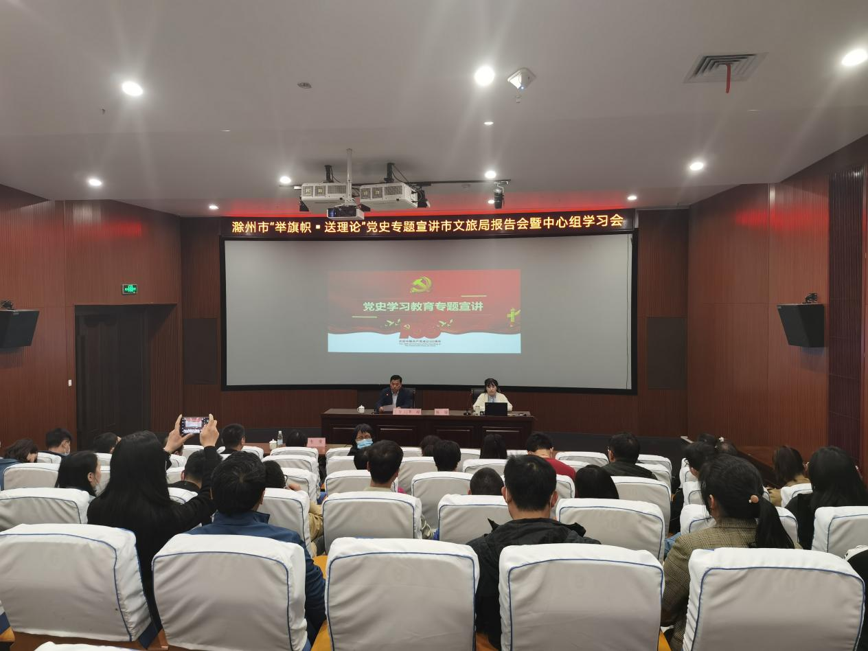 4月29日下午,滁州市“举旗帜·送理论”党史专题宣讲市文旅局报告会暨中心组学习会在市博物馆举行。滁州日报社记者部主任施璇应邀作专题辅导报告。市博物馆全体工作人员参加报告会。