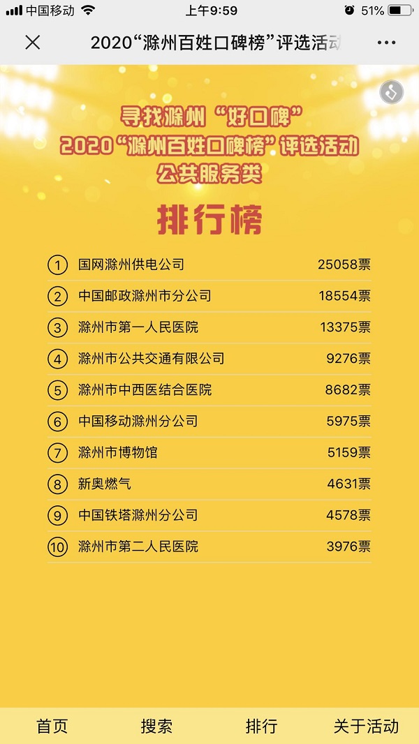 历经5天的评比,3月3日,由滁州日报社、滁州广播电视台等媒体主办的2020年度“滁州百姓口碑榜”在3大行业进行全民票选的宣传评选活动落下帷幕,必威betway精装版app共获得5159票,在公共服务类评选中荣获第七名。