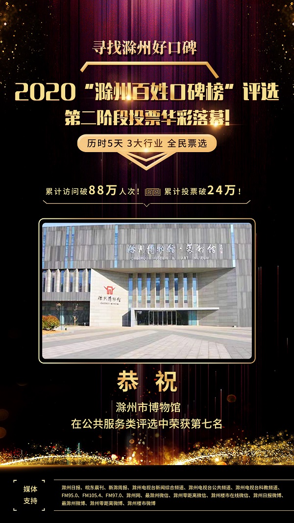 滁州市博物馆在公共服务类评选中荣获第七名,体现了广大群众对博物馆的认可,滁州市博物馆将不负众望,努力为观众做好服务工作。