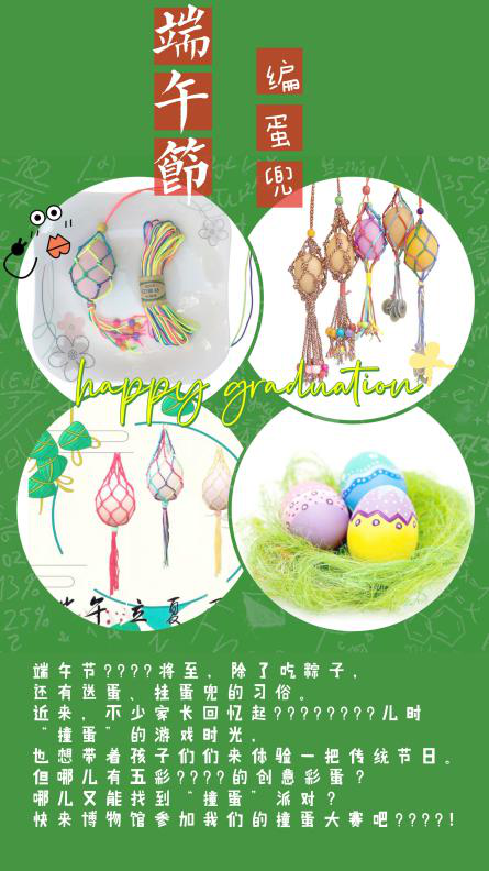 3.宣教活动:端午宣教活动巧手编蛋袋,由讲解员科普端午小知识,讲述端午的由来及民俗故事,组织同学们动手画彩蛋、编制蛋网。
