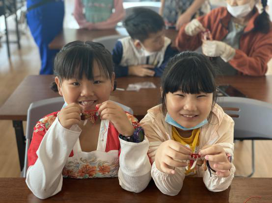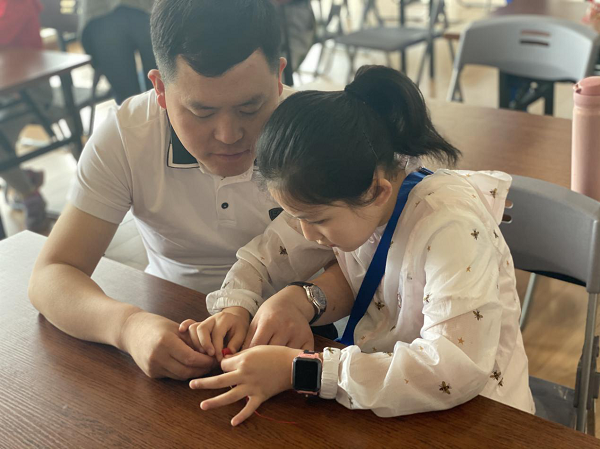 活动中,工作人员通过PPT向大家详细地介绍了“秋分”与“红绳”的民俗知识。同学们全神贯注地聆听了老师的讲解,积极举手展示自己并和家长亲子协作,用自己的巧手编成了一件件属于自己的红绳挂饰。