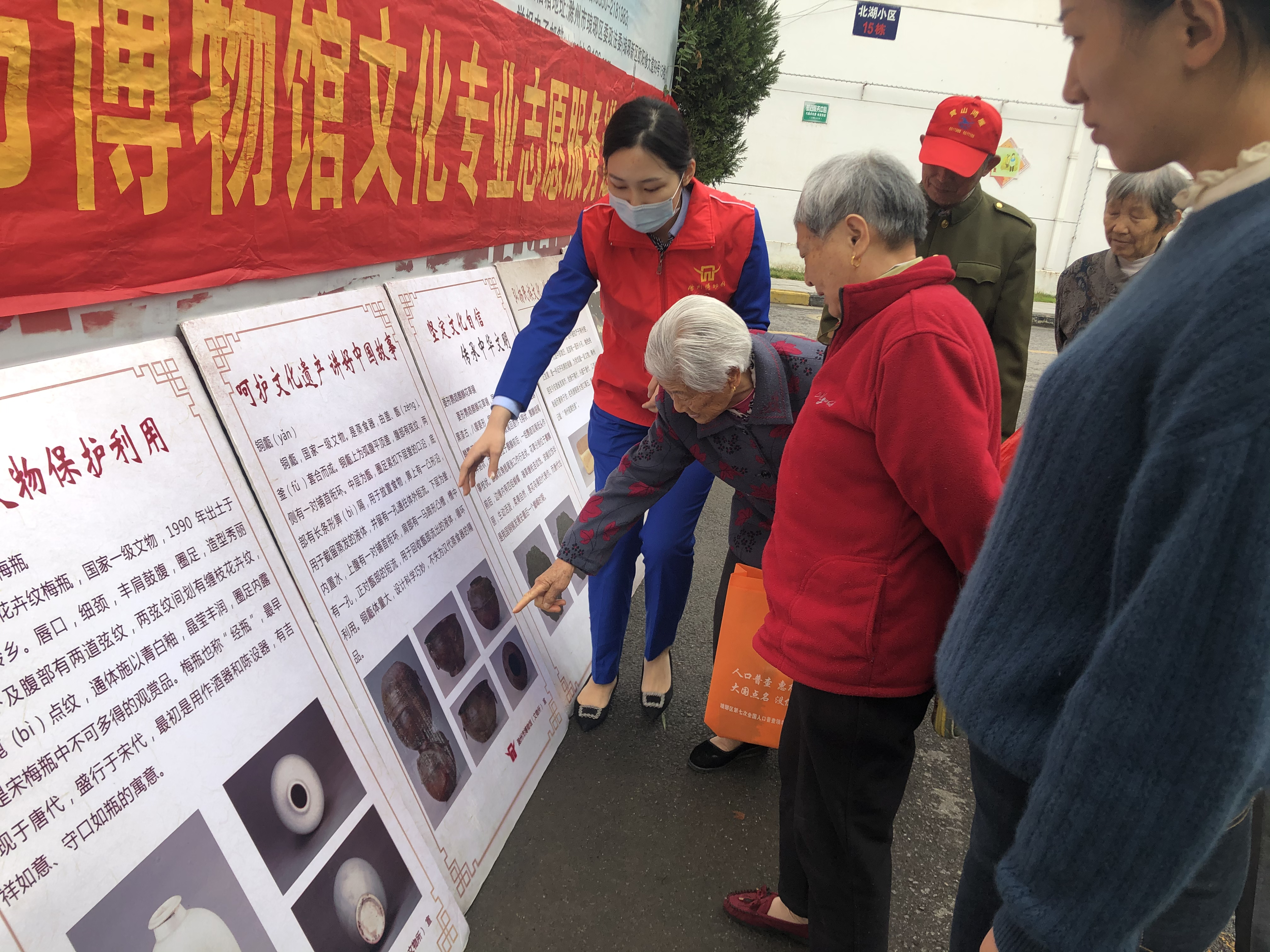 志愿者们将文物展板设在社区人流较多的活动场地,吸引了许多群众围观,受到了普遍欢迎和积极参与。志愿者们为社区居民详细科普文物知识,听讲的群众们表示将带上家人亲身走进博物馆感受文物魅力。参观的社区工作者们也表示:“我们非常支持博物馆送文化进社区这样的活动,使居民在家门口就可以受到文化的熏陶,今天大家又看又听又学了这么文博知识,相信都受益匪浅。”
