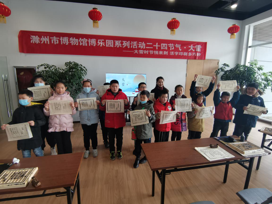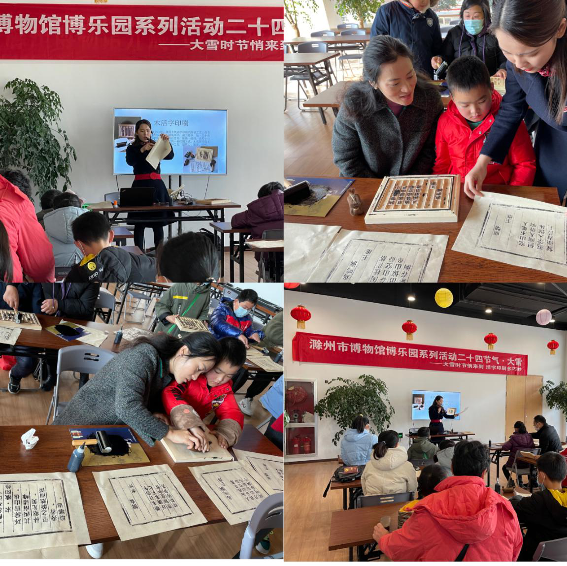 博物馆的讲解员老师给学员们介绍了大雪节气的来历、节气特征、关于大雪节气的诗文等等,介绍了中国的四大发明,演示了指导木活字印刷术的印刷流程,共同解读本次活动所要印刷的《醉翁亭记》、《悯农》、《春夜喜雨》等古诗词字画。手工作品完成后,一首首反映风土人情的古典诗词画跃然于纸上。