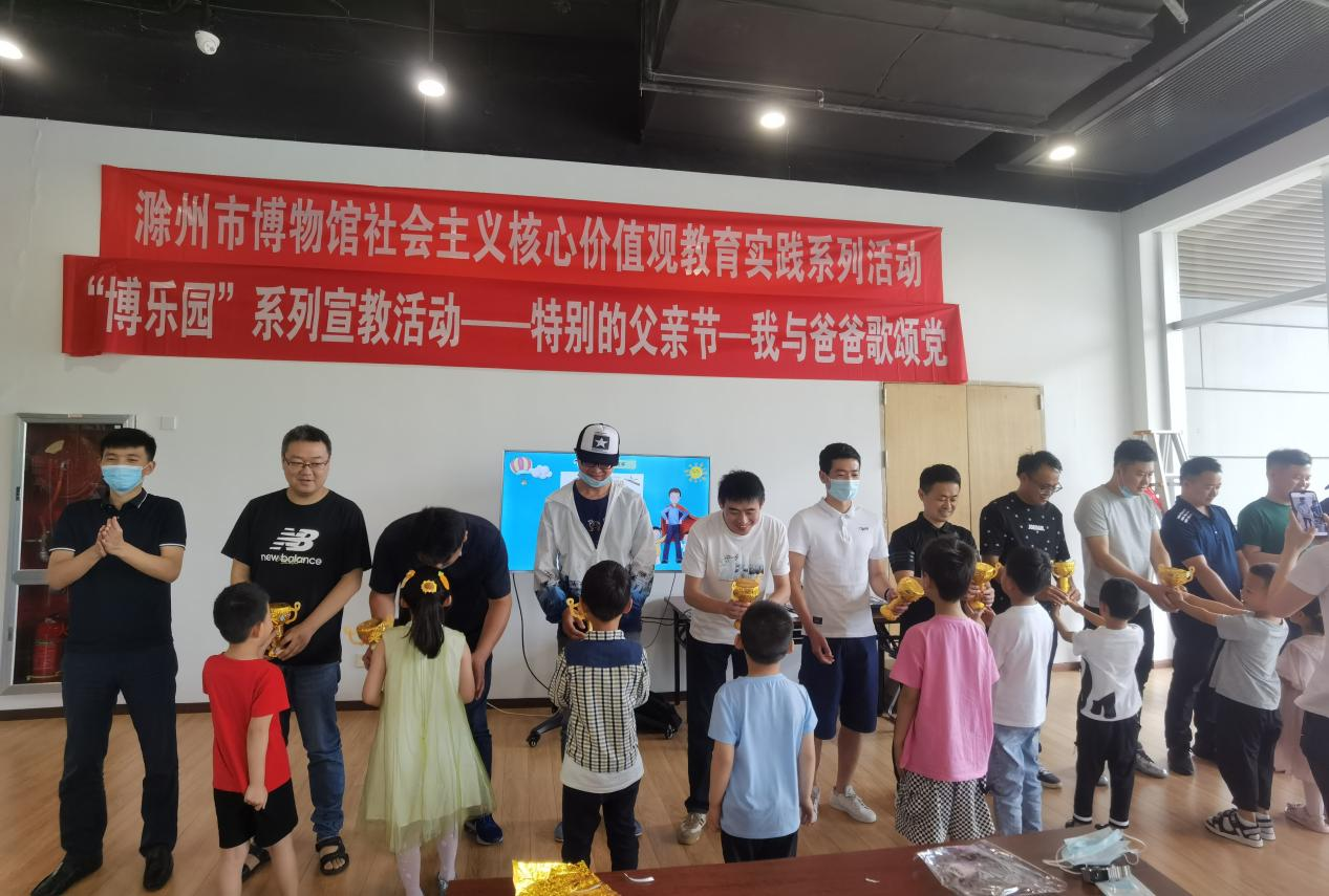 活动开始,宣教员老师结合PPT为大家讲述父亲节的由来,同时将跌宕起伏、风云激荡的滁州百年党史呈现给大家,将答题游戏与“辉煌皖东100年”发展史紧密结合,参赛家庭认真聆听、团结协作,竞赛过程高潮迭起、扣人心弦。随后,孩子与爸爸们共同表演了诗歌朗诵《清平乐.六盘山》、红色小故事《爸爸带我唱红歌》、歌曲《我和我的祖国》等等。在大家的分享中,孩子们对红色精神也有了更深层次的认识。最后,小朋友们亲手制作了奖杯并颁发给自己的父亲,表达了对父亲的感谢和爱意。
