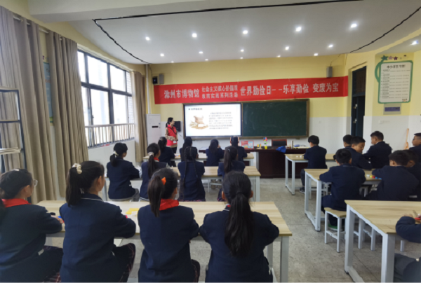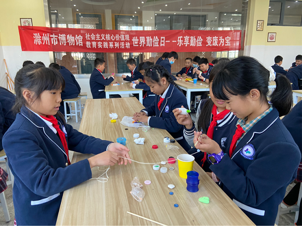 活动伊始,博物馆志愿者先播放了一段相关视频,介绍了“世界勤俭日”的相关知识,让学生们意识到浪费的严重性,随后协助学生们用废旧物品制作工艺品。活动中,志愿者鼓励学生们要树立节约光荣、浪费可耻的观念,并发出倡议,践行“光盘行动”,节约用水、用电,低碳出行,学生们纷纷响应。