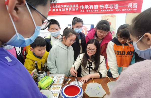 “凤阳凤画”为明清时“皖北三绝”之一,是最具代表性的地域优秀文化之一。此次活动邀请了中国陶行知研究会非物质文化遗产教育研究会专委会理事、凤画研究会副会长陈海珍为大家讲解“凤画”的发展历史及其所代表的文化内涵。