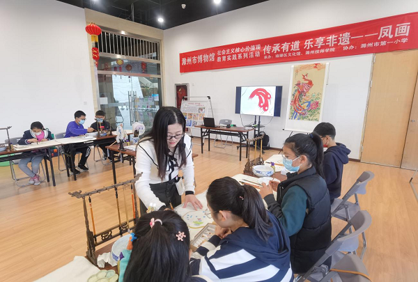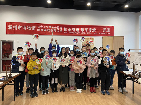 在博物馆交流坊,陈海珍老师讲解道:凤画源于明初,多以凤凰为主题,象征吉祥幸福,是安徽省凤阳县一带流传的民间绘画形式,距今已有六百余年的历史,2006年入选安徽省首批省级非物质文化遗产名录。凤画以“蛇头”“龟背”“鹰嘴”“鹤腿”“鸡爪”“如意冠”“九尾十八翅”的独特艺术造型及富贵吉祥的形意、色彩艳丽的艺术形象受到大众的喜爱和推崇。