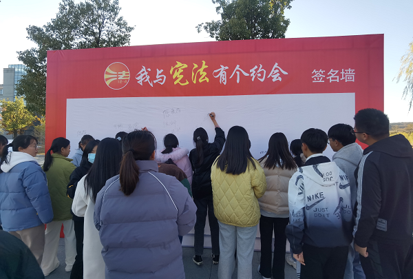 学生们踊跃参与,在国家宪法日的主题墙前,集体朗诵了中国特色社会主义法治理念。随后,博物馆志愿者给学生们普及了法律法规的知识,增进学生们对法律法规的了解,提升学生们的法治观念。活动最后,学生们纷纷在签名墙上郑重签下自己的名字,践行法治理念,维护宪法权威。