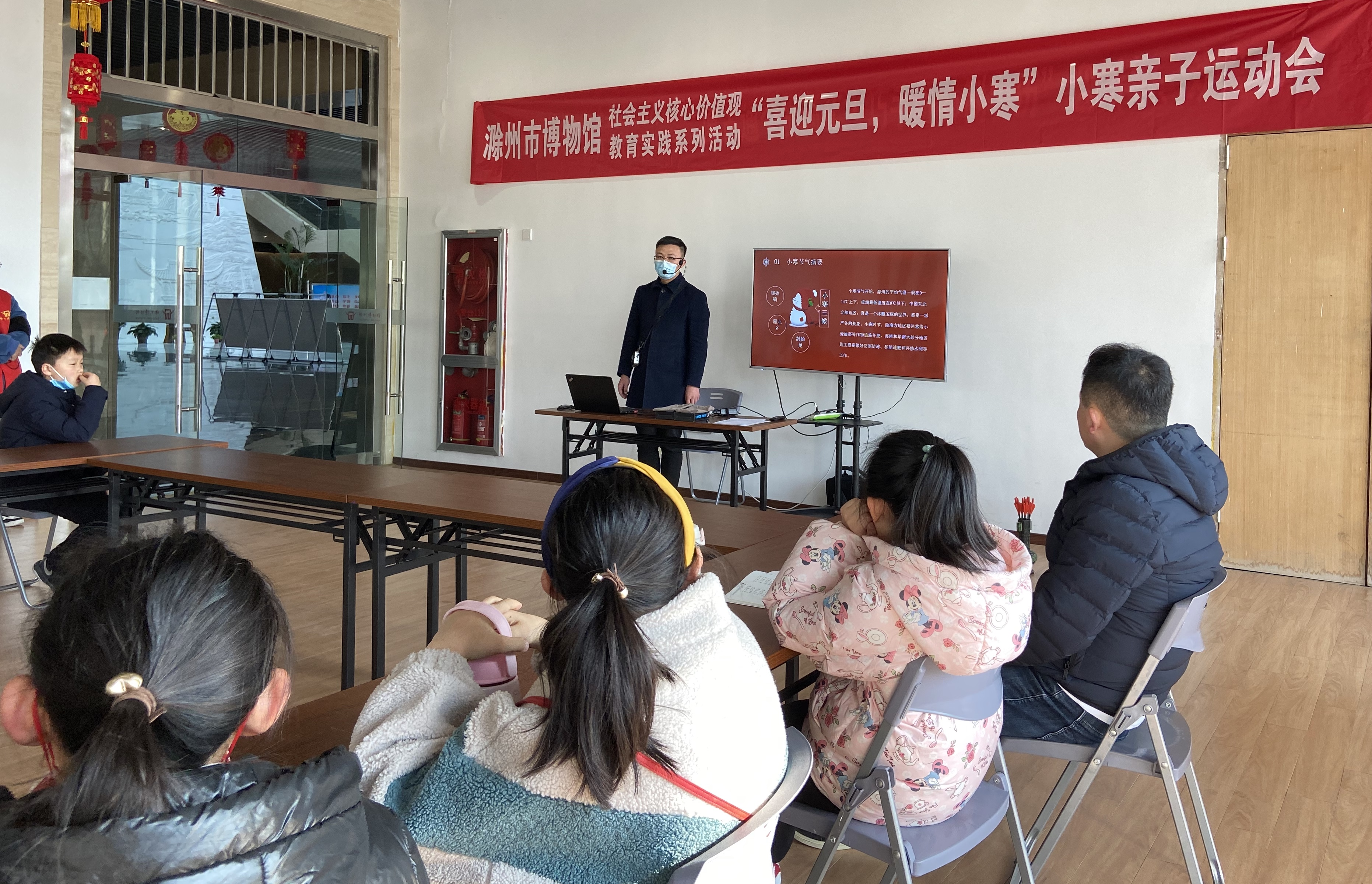 此次活动在博物馆交流坊举行,活动开始,讲解员通过PPT向大家介绍小寒节气的由来,普及了记载小寒节气的相关谚语及古代诗文。