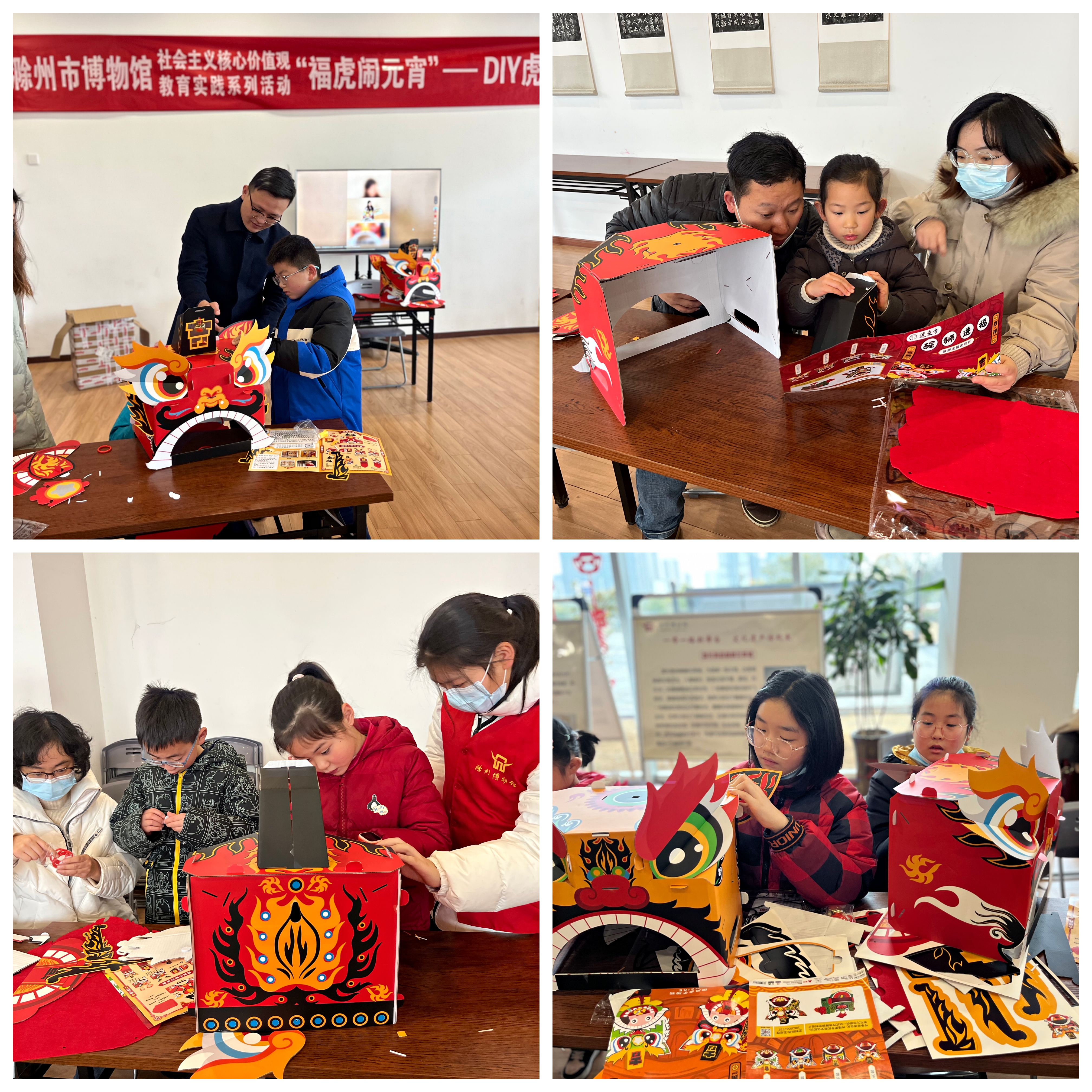 活动开始,讲解员介绍了元宵节的相关知识,让大家全面了解元宵节的起源和节日习俗。随后,讲解员给大家分发活动材料,自己动手制作元宵虎头帽,在小朋友们的努力和家长的帮助下,一个个虎气十足的虎头帽就制作完成了。讲解员还带领大家戴上虎头帽,进行了一场别开生面的舞狮活动。