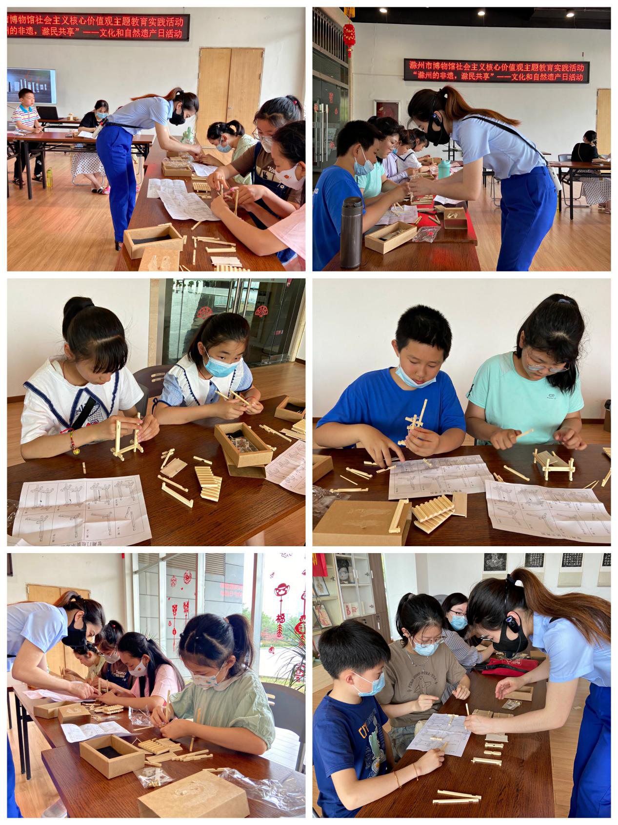 活动开始,讲解员老师利用PPT为大家科普了文化和自然遗产日的相关知识,列举了我国典型的世界级文化和自然遗产,也让大家了解了家乡滁州的众多文化遗产。老师通过一些榫卯木构件图片,带大家了解我国传统木质建筑榫卯工艺的特点和优势,并一起制作蕴含榫卯工艺的益智手工摆件“智趣门”。大家开动脑筋,在拆装过程中,亲身体验非遗文化。