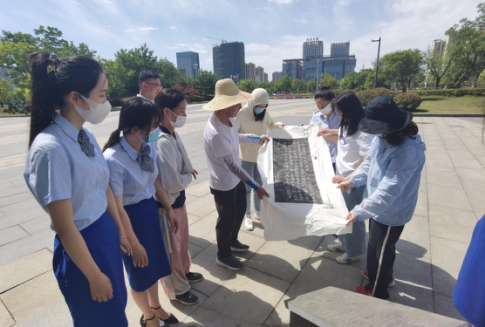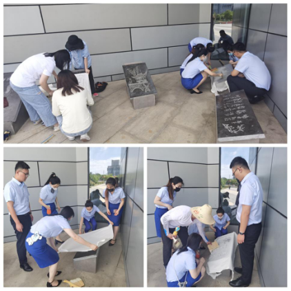 本次培训过程中,汪茂来老师全方位展示了拓印技术的整个过程。首先清洁石碑、涂刷专业制剂、铺好生宣,润湿纸张后锤打均匀以清除气泡,让宣纸紧紧贴于碑文之上,最后,待纸张干透之际,用拓包涂上墨汁均匀拍打进行拓印,一件完整的拓片作品就制作完成了。现场参与培训的馆内人员在汪茂来老师的指导下,实操了拓印技术,完成了拓片的制作。