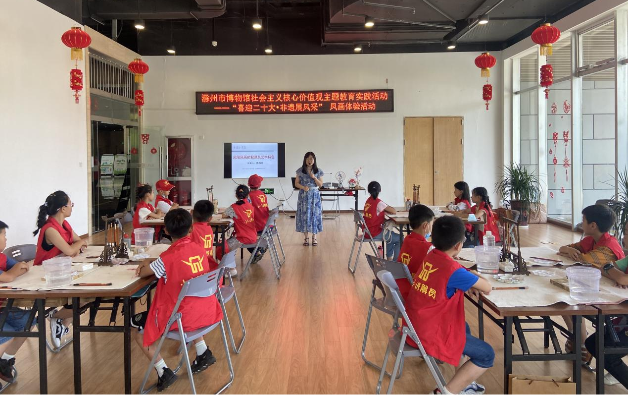 为了丰富滁州市青少年的假期生活,鼓励孩子们走进博物馆,了解滁州的历史及非遗文化,7月12日必威betway精装版app开展“喜迎二十大,非遗展风采”—凤画体验活动。此次活动邀请了安徽滁州技师学院凤画传承负责人、滁州市民间文艺家协会副主席陈海珍老师为大家讲解“凤画”的发展历史和文化内涵。