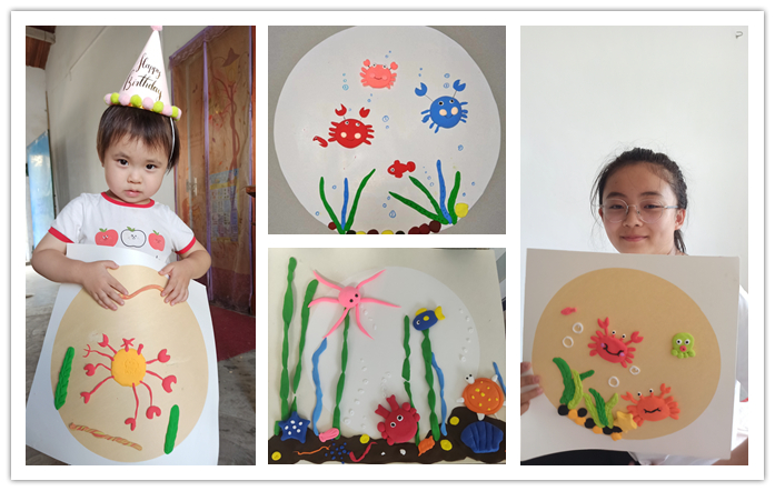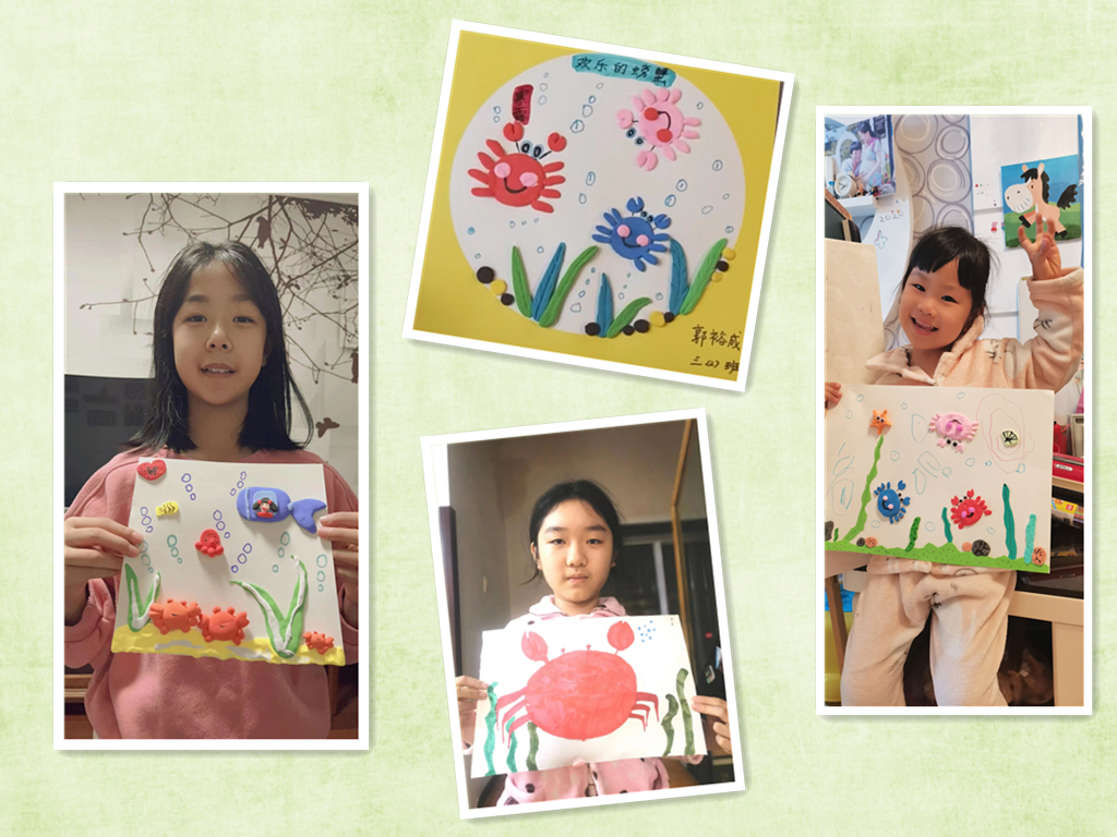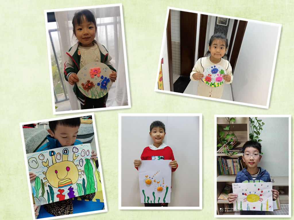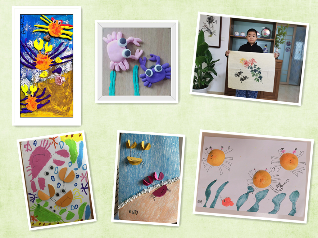 小朋友们展开丰富的想象力,自由发挥创作。彩纸、黏土、橙子皮等在他们的手中变成了惟妙惟肖的小螃蟹。大家纷纷将做好的螃蟹手工画拍照发送至宣教活动群中。通过一幅幅生动的作品可以看出,小朋友们构思巧妙,做得有声有色,趣味十足,让我们不禁感叹他们的创造力。