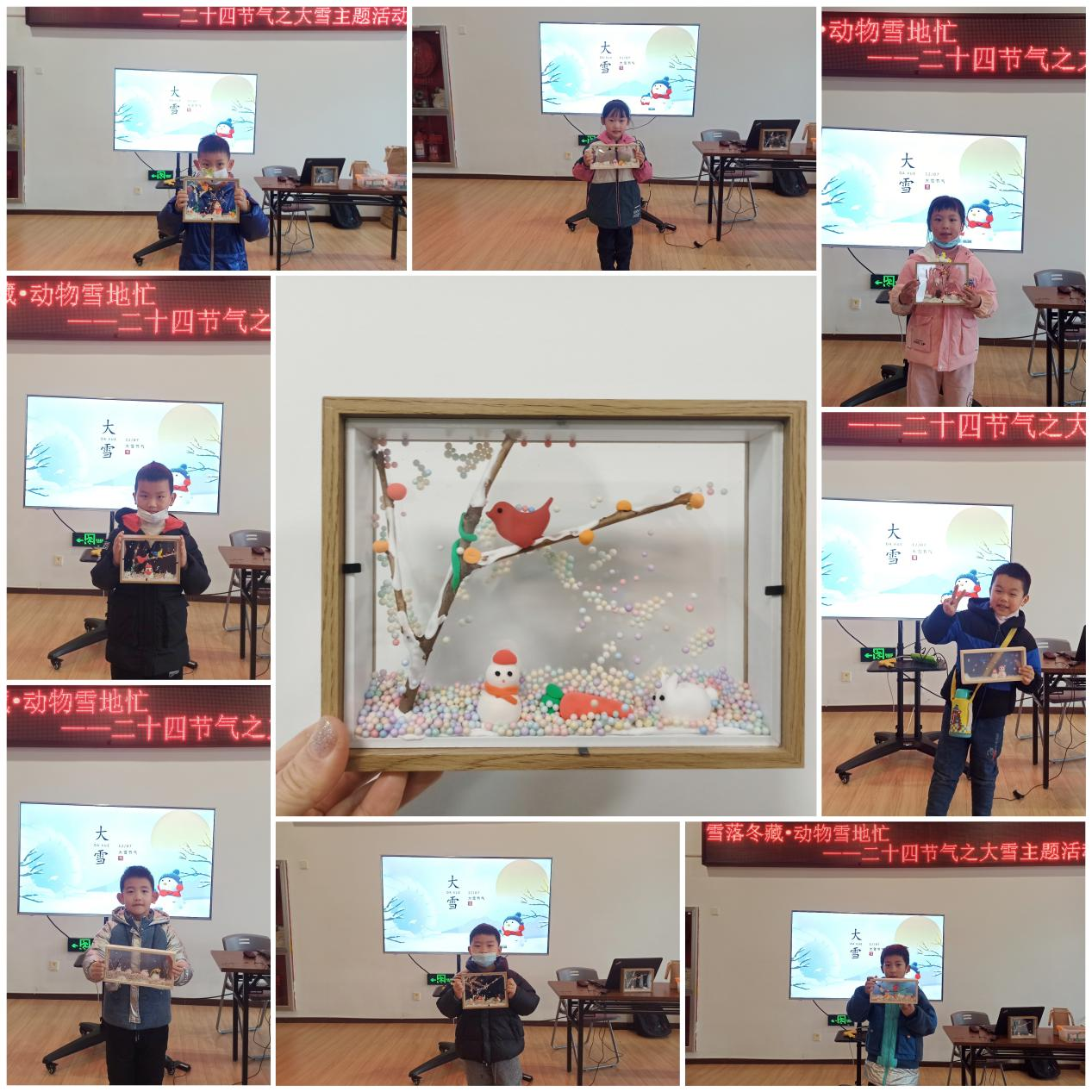 “大雪的时候为什么不下雪?”“为什么会有瑞雪兆丰年这一说法?”在博物馆交流坊,讲解员老师为孩子们讲述了大雪的由来、天气特点及习俗等相关知识。随后老师和孩子们一起寻找藏在博物馆里的小动物们,并向孩子们介绍这些小动物冬天都在做什么。通过互动问答,孩子们在开动脑筋的同时了解到更多知识。DIY动手环节中,在老师的指导下,孩子们发挥想象力,用彩色黏土捏出一只只可爱的小动物,制作出属于他们的动物雪景立体手工。