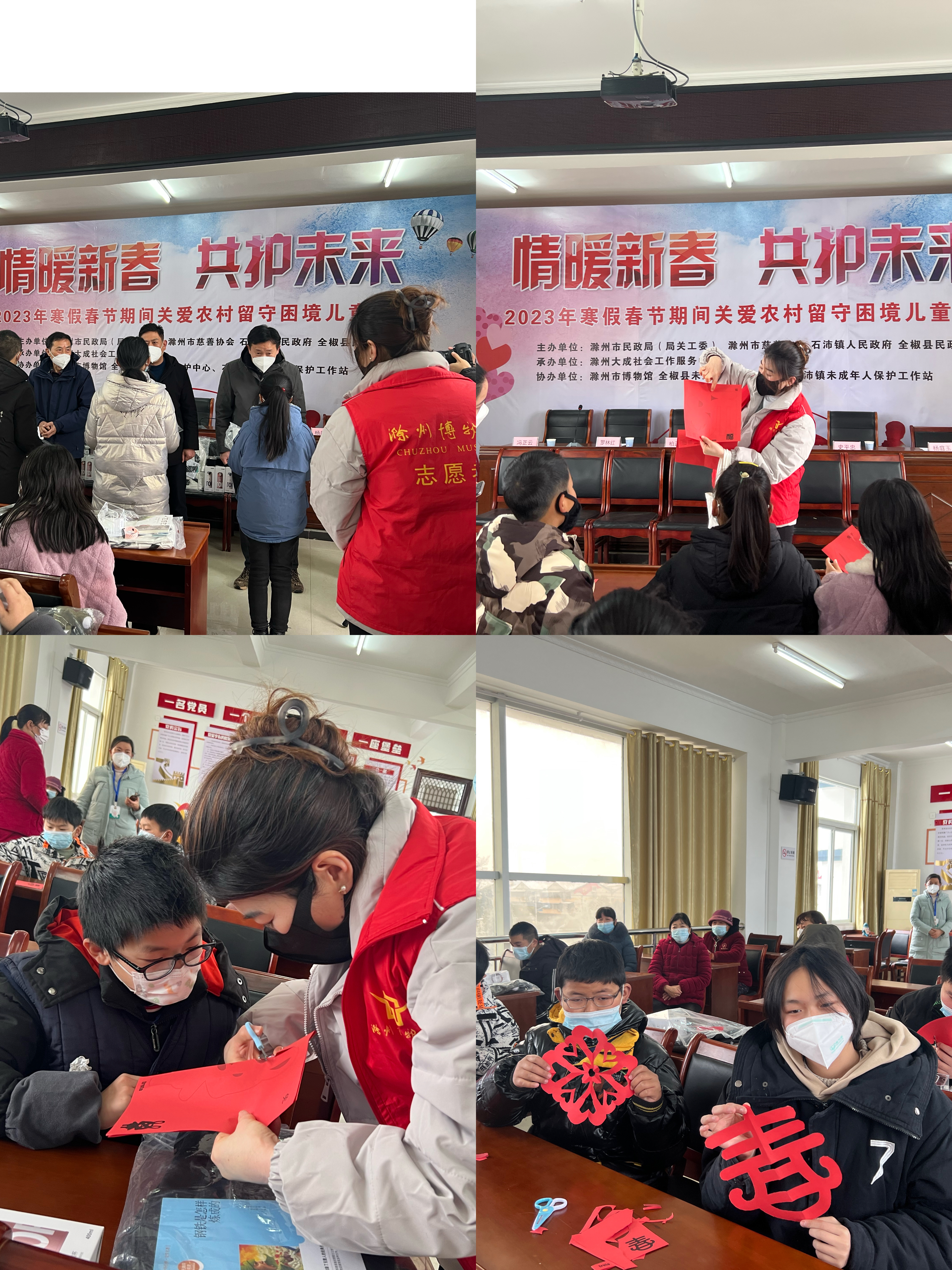 1月15日,必威betway精装版app协同滁州市民政局(局关工委)、滁州市慈善协会、全椒县石沛镇人民政府、全椒县民政局、滁州大成社工中心等单位前往全椒石沛镇大季村委会开展“博爱春蕾”关爱留守困境儿童主题活动,为留守儿童送去爱心礼包。