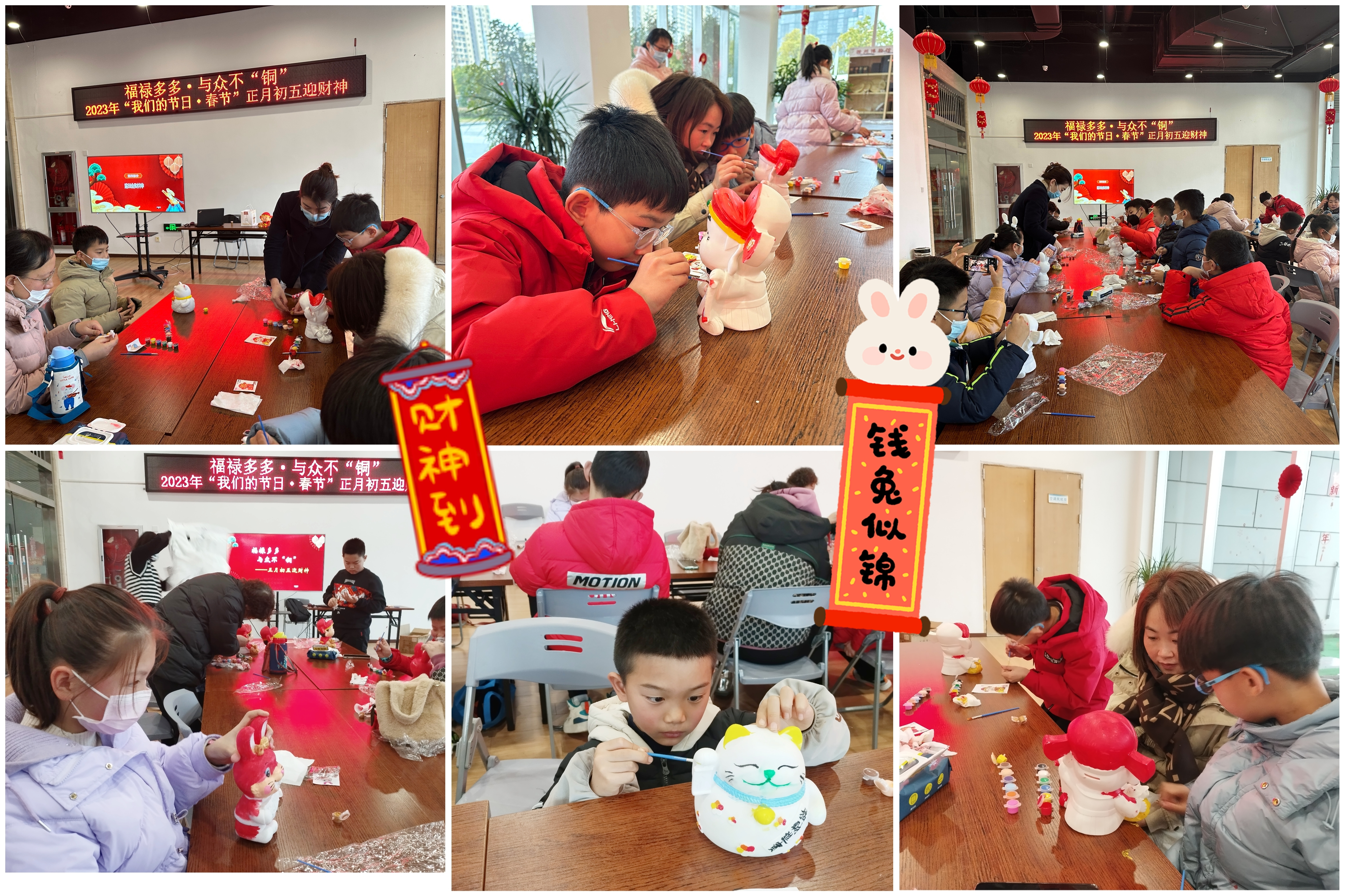 活动现场,讲解员老师介绍了迎财神习俗的由来、注意事项和五路财神。说到财神当然离不开钱,讲解员老师带大家一起了解了中国钱币的发展历史,并重点介绍了博物馆里各朝代的铜钱。随后游戏互动“这个多少钱”,小朋友们积极参与,热闹非凡。到了彩绘财神手工环节,大家发挥想象,挑选自己喜欢的元素、笔触与色彩,赋予可爱的石膏娃娃以多彩的生命。在家长与孩子们的共同努力下,财神爷、财神兔、招财猫,一个个可爱漂亮、创意十足的石膏娃娃诞生了。