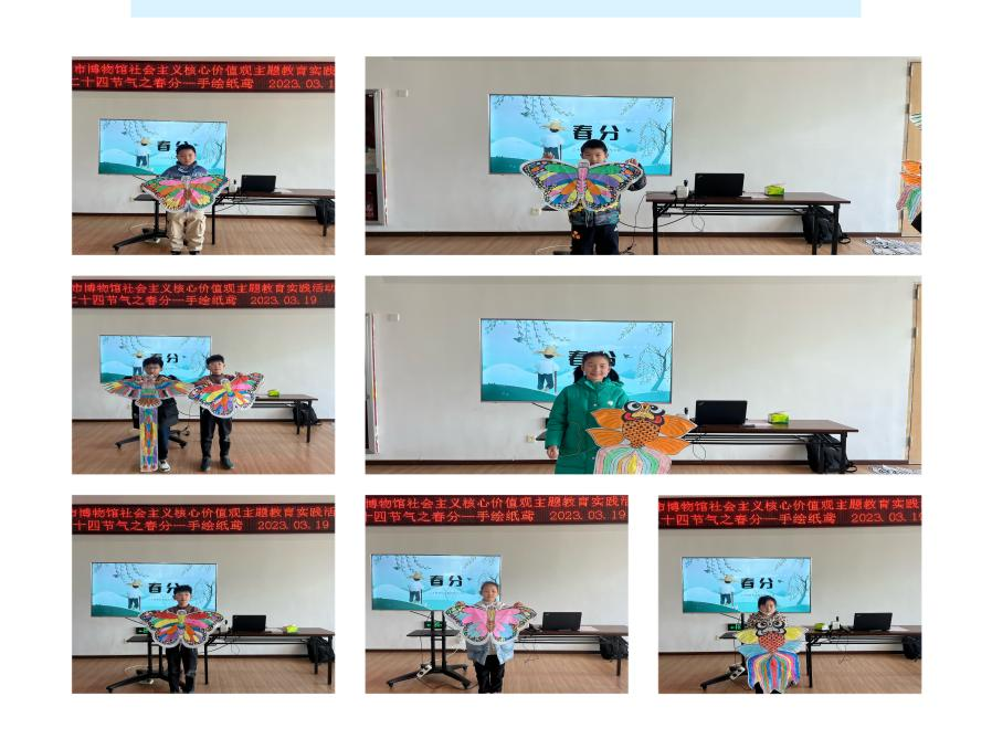 讲解员老师给孩子们讲述二十四节气中春分节气的由来、习俗及放风筝的好处等,并开展了相关的知识问答和讨论交流,让孩子们在互动中加深对春分节气的了解,同时寓教于乐,组织孩子们开展了妙趣横生的手绘风筝活动。整个活动分“彩绘风筝、展示风筝、放飞风筝”三个环节开展。孩子们拿起画笔,在风筝上绘出了五彩斑斓的图画,这些形态各异、活灵活现的风筝,为美丽的春天增添了别样的色彩;风筝展示环节,孩子们秀出了自己的创意作品,秀出了属于自己的精彩;放飞风筝环节将整个活动推向了高潮,孩子们在院子里开心地奔跑,放飞风筝,放飞自己的梦想,与春天进行了一次亲密对话。