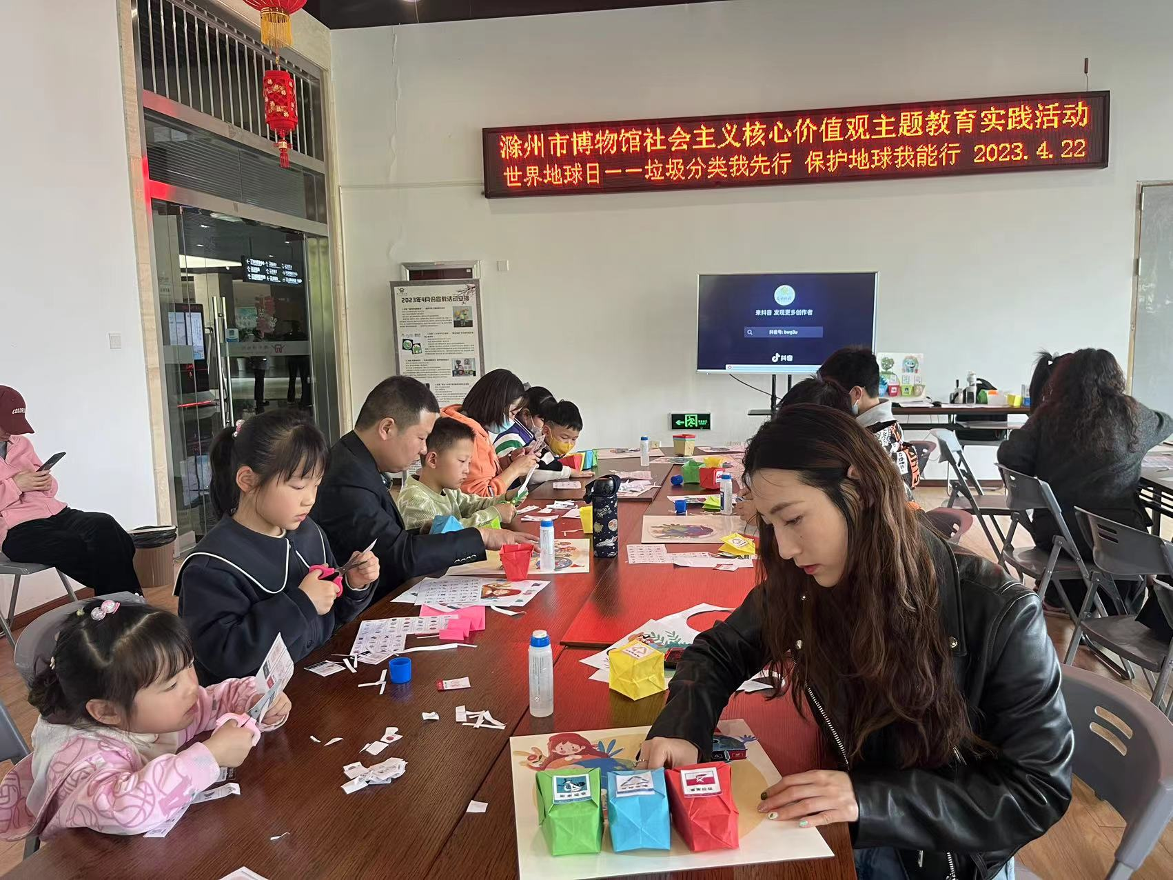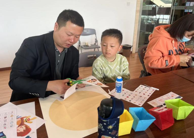 在手工制作环节,讲解员老师手把手地教孩子们手工制作益智垃圾分类垃圾桶。孩子们与家长相互配合,手中的一个个小零件成功组装成益智垃圾分类桶,再进行折叠、粘贴、裁剪,最终成为了一幅创意美术作品。