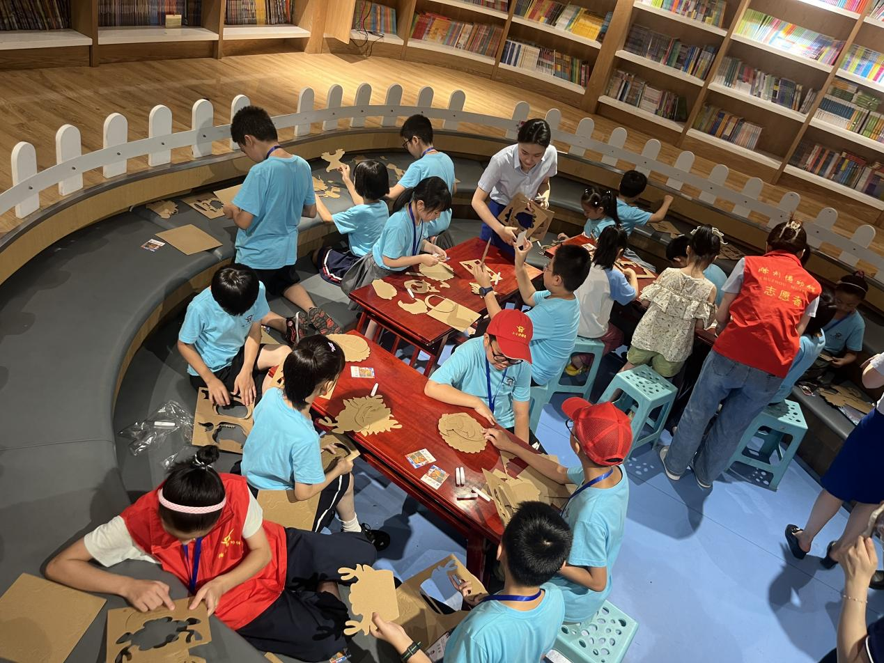 摆放好书籍后回到活动区,博物馆讲解员老师带大家制作门环手工。神兽门环是安装在大门上衔门环的一种底座,它是中国传统的大门装饰。学员们运用纸板、白胶、颜料等简单的工具,在老师的指导下进行创作。大家充分发挥自己丰富的想象力,大胆运用各种颜色,认真塑造,完成了自己独一无二的作品。