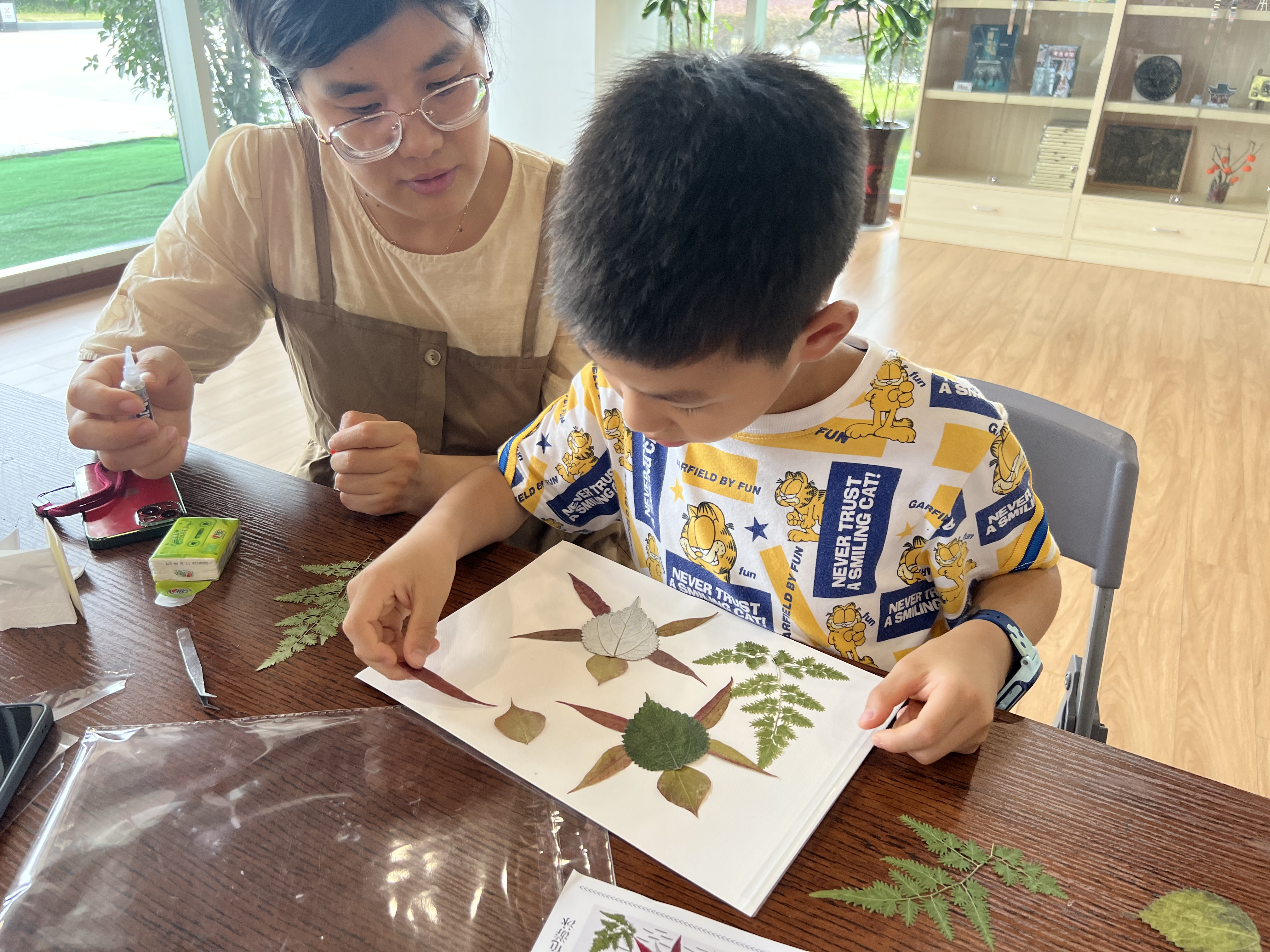 活动中,博物馆讲解员老师为孩子们普及了立秋节气的气候特征、风俗和立秋相关的古诗词等,并带领孩子们到一楼自然展厅森林区域实地参观了各种树种,识别不同植物的树叶。最后在手工制作树叶画环节,孩子们在讲解员老师的指导下发挥想象力,纷纷把对美好景色的喜爱都倾注到了一张张画纸上,制作完成了一幅幅精美的创意画。