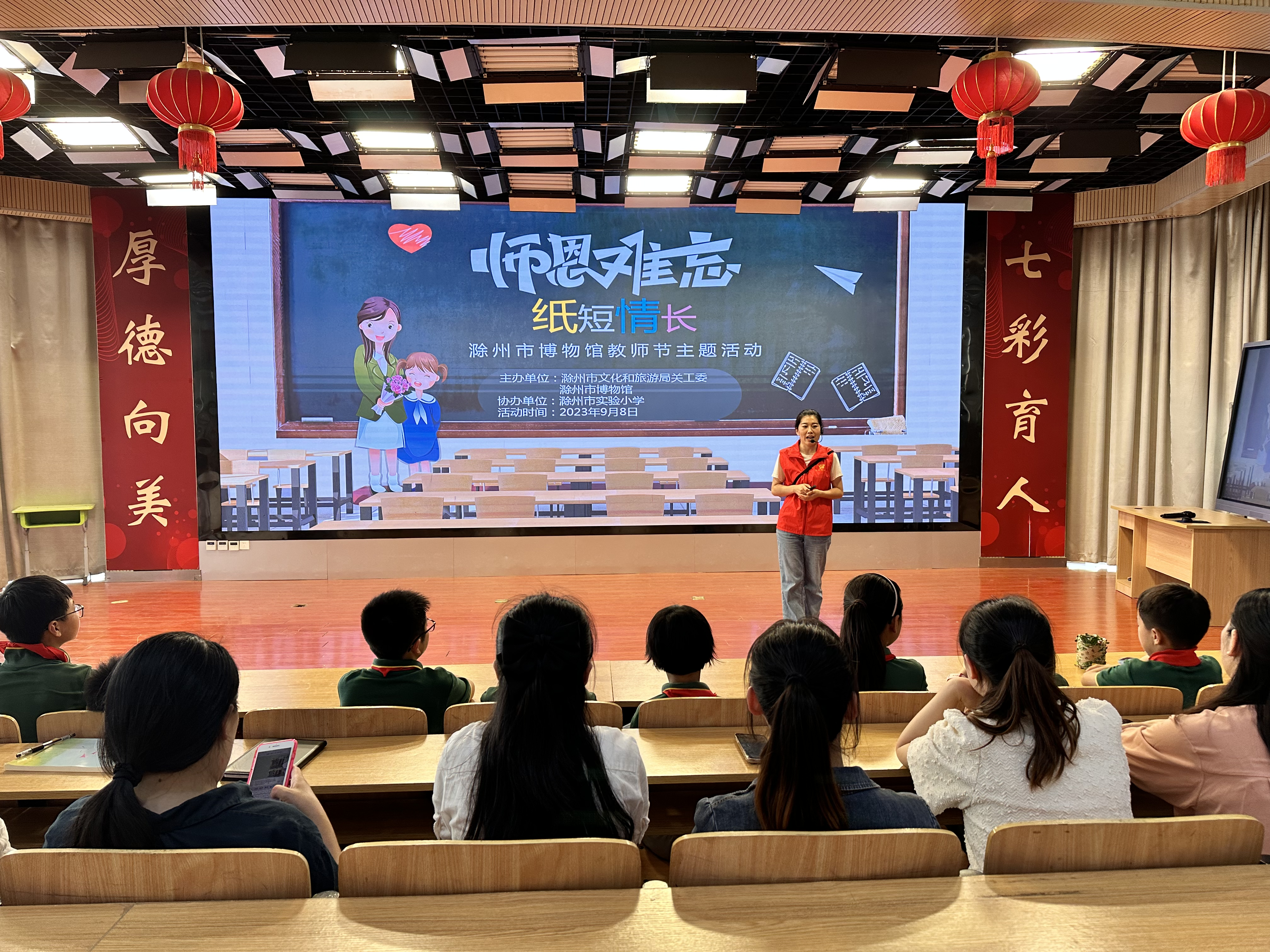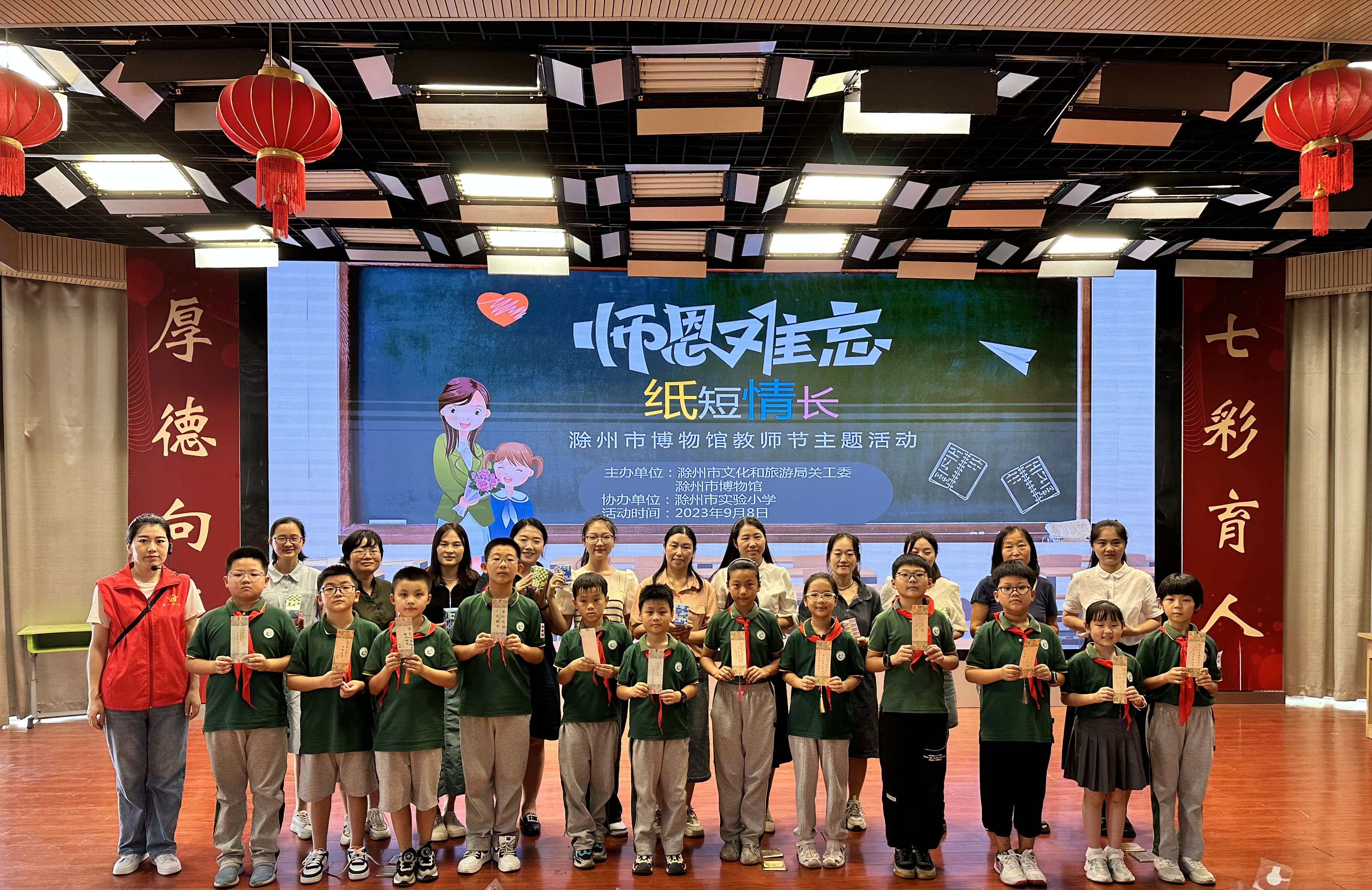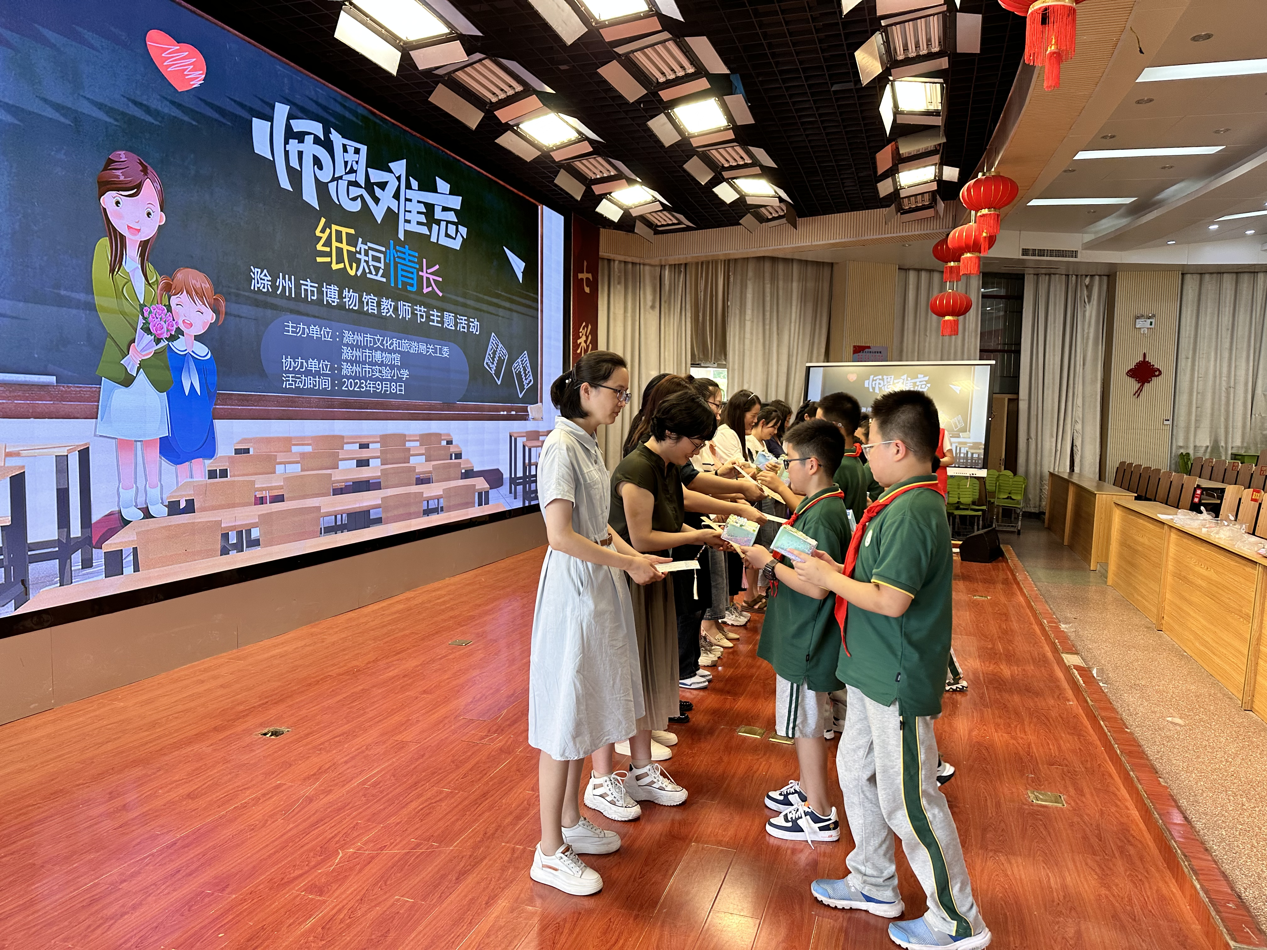 来自实验小学的12名“小小讲解员”们通过文物知识展板向老师们详细介绍了博物馆的相关情况和馆藏文物知识。通过他们的专业讲解,让平时忙于教学的老师们更直接地了解了滁州博物馆以及滁州的历史文化。分享课堂上,博物馆讲解员老师向大家讲述了教师节的来历以及从古至今尊师重教的优良传统,增加了同学们对节日的认识。随后学生们亲手制作精美的手工笔筒送给老师,表达对老师深深的谢意和崇高的敬意。老师们也手写书签,将良言金句赠予学生们。