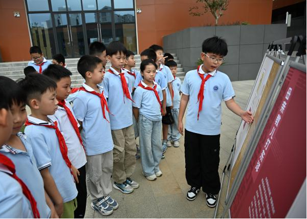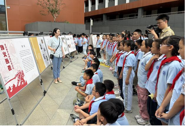 博物馆讲解员在紫薇小学的校园内精心布置了文物展板与抗战 80 周年主题展板,既有滁州本地历史文物的图文介绍,更聚焦抗战历史,生动再现了抗战时期滁州地区军民浴血奋战、抵御外敌的英勇事迹。博物馆讲解员们逐一向孩子们讲解展板背后的故事。从文物所承载的历史记忆,到抗战英雄们的感人壮举,孩子们听得聚精会神,不时驻足凝视展板,眼神中充满了对历史的敬畏与对英雄的崇敬。
