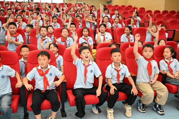 互动问答环节中,讲解员围绕讲述的抗战知识提出问题,“在战场上,用来传递命令、鼓舞士气的一种乐器是什么?”“你能说出一位抗日小英雄的名字吗?”同学们争先恐后,踊跃举手抢答,现场气氛紧张又活跃。孩子们不仅回答准确,更展现出对历史的浓厚兴趣和良好的知识素养。每位答对的同学都获得了博物馆特别准备的精美小纪念品。
