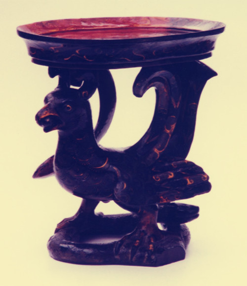 此器物通高28.5厘米,造型奇特,装饰华丽,朱雀两爪抓住一条盘成环状的蛇,蛇的头枕在自己的背上,蛇尾返翘顶在朱雀的尾部,两只描金的菱形的眼睛两只描金的菱形的眼睛炯炯有神,两只描金的菱形的眼睛炯炯有神,蛇身通体饰菱形纹,朱雀扬颈、振翅、目视前方,朱雀的羽纹均采用描金的手法,喙内衔一颗椭圆形珠。凤鸟衔珠,传说甚古,蕴涵吉祥之意。朱雀用头、尾和双翅顶着腰果形漆盘,漆盘内髹朱红,外髹酱黑,正所为“朱画其内,墨染其外”十分醒目,构成了强烈的时代风格。