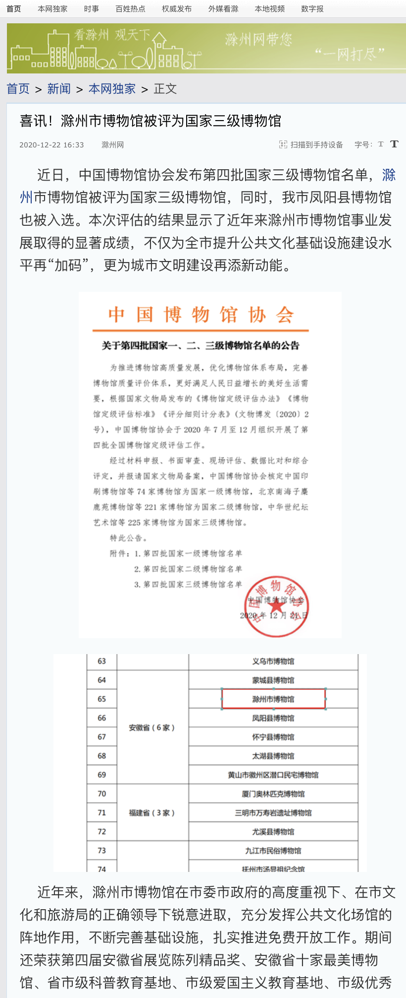 【滁州网】喜讯!必威betway精装版app被评为国家三级博物馆
