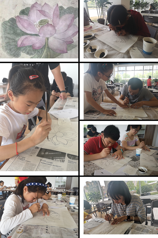 下午孩子们在老师的带领下走进工笔画的世界,欣赏大师们的精品画作。老师介绍的第一幅作品《出水芙蓉》,从绘画的题材、构图、线条、布局、意境、创作背景等多个角度进行了讲述,鼓励孩子认真观察并引导他们发现中国的“美”。孩子们仔细聆听,积极互动,争先恐后回答老师的每个问题。老师重点介绍了工笔画的特点、技法、握笔方法并鼓励他们现场白描绘出一幅自己的作品。现场非常安静,每个孩子都在认真聆听老师交代的注意事项,一笔一画,认真细致。