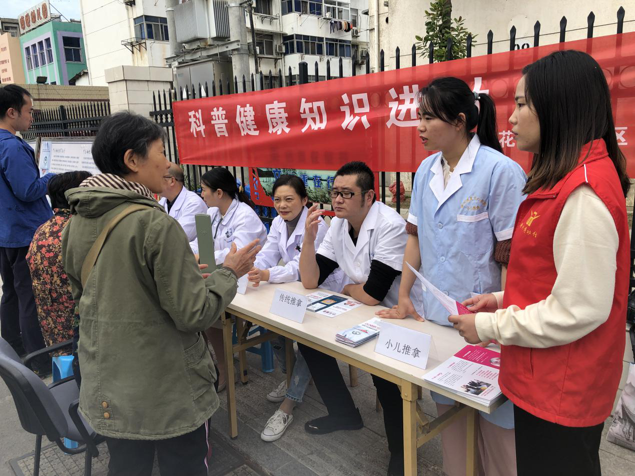 志愿医护人员为老人解答疑问
