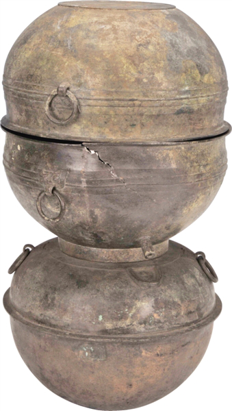 早在新石器时代,先民们就使用陶甗来蒸煮食物,那时甗的造型分为合体式和分体式两种。到了商代,人们移植陶甗的造型,铸造出青铜甗。这时甗的造型也变得多种多样,除了分体式和合体式,还出现了三联体式,看上去像是放在一条长案上的三口大蒸锅。
