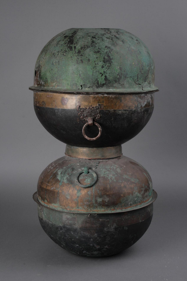 当这件巧夺天工的炊器再一次呈现在世人面前,会让人由衷地感叹。细察这件汉铜甗,它高 48.5 厘米,腹围 84.8 厘米,重 6680 克。由釜、甑、盆套合组成。