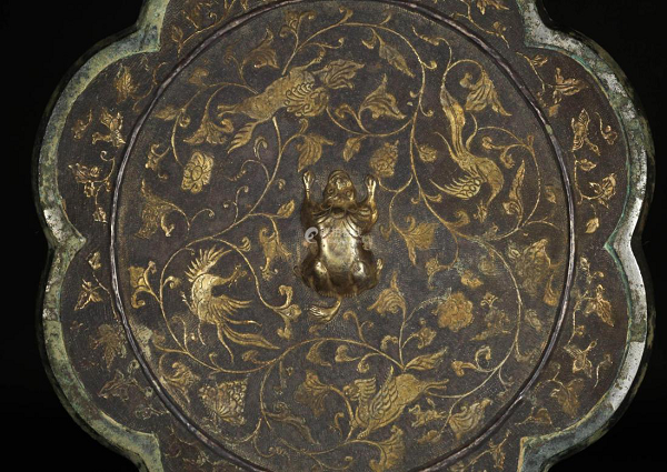 (唐代银壳鎏金兽鸟缠枝纹铜镜)