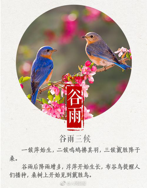中国古代将谷雨分为三候:“一候萍始生;二候鸣鸠拂其羽;三候戴胜降于桑。”是说谷雨后降雨量增多,浮萍开始生长,接着布谷鸟便开始提醒人们播种了,然后是桑树上开始见到戴胜鸟。