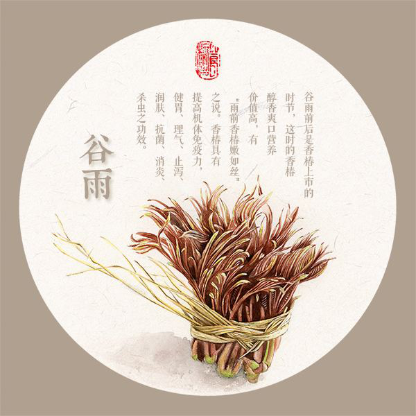 北方则有谷雨食香椿的习俗,谷雨前后是香椿上市的时节,这时的香椿醇香爽口营养价值高,有“雨前香椿嫩如丝”之说。香椿具有提高机体免疫力,健胃、理气、止泻、润肤、抗菌、消炎、杀虫之功效。