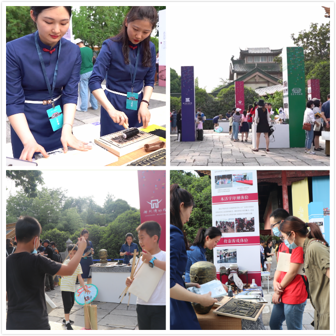 除了展区的馆藏文物展示外,滁州博物馆和全椒吴敬梓纪念馆在活动区设置了研学活动场地供参观者欣赏、游玩。展台特色鲜明、内容丰富、形式新颖,同时在讲解员落落大方的引导解说下,一时间展台前也游人如织,其中木活字印刷体验和投壶游戏寓教于乐,全椒吴敬梓纪念馆推介的研学游活动备受好评。
