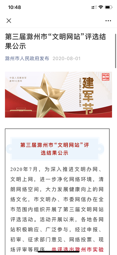 为持续推进文明办网,营造清朗的网络空间,市文明办、市委网信办联合在全市范围内开展第三届滁州市文明网站评选工作。共有60家机关事业单位参与评选,经过申报、初审、网络投票、现场评审、公示等环节,市博物馆共得11258票,获得第三届滁州市“文明网站”荣誉称号。