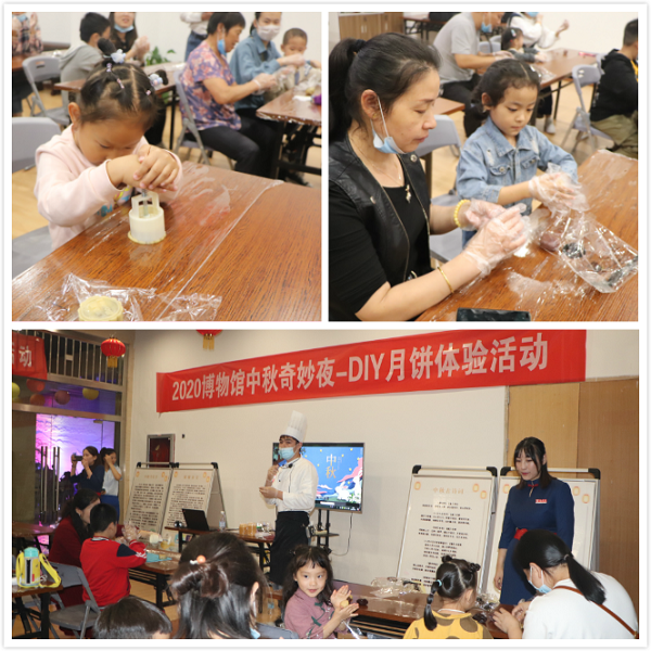 作为本次“博物馆中秋奇妙夜”活动的首项内容,我馆特别招募十几对亲子家庭,精心邀请糕点师教授月饼制作手法。在专业人员的指导下,父母与孩子或分工合作或分头制作,从准备材料、揉制面团到按压成型,每个步骤有条不紊,月饼DIY的现场气氛十分活跃。