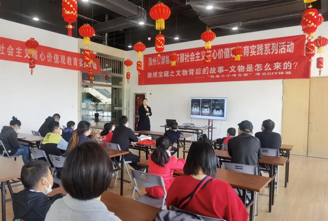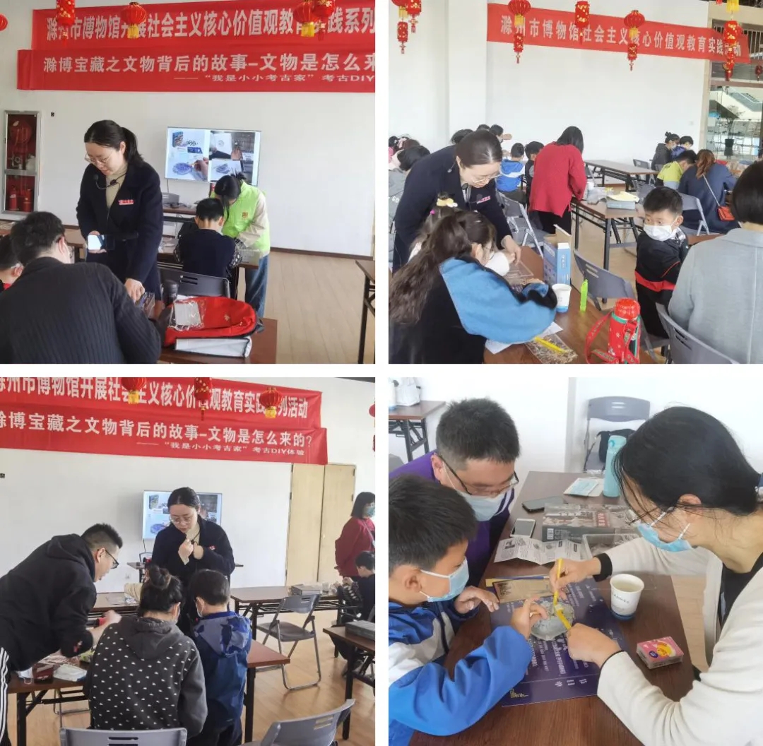 活动中,讲解员向小朋友们介绍了文物发掘的相关知识,并带领参观了滁州博物馆展陈的各类文物及矿产资源。在接下来的模拟考古环节,小朋友们更是报以极大的热情,每位“小小考古家”都拿到了一块石膏,用木棒和刷子小心翼翼地挖掘出深藏在其中的“文物”。此环节需要细心和耐心的配合,“小小考古家”们感受到了考古发掘工作并不是一蹴而就的,每一步都必须保持细致和谨慎,这样才能收获最后的成果。