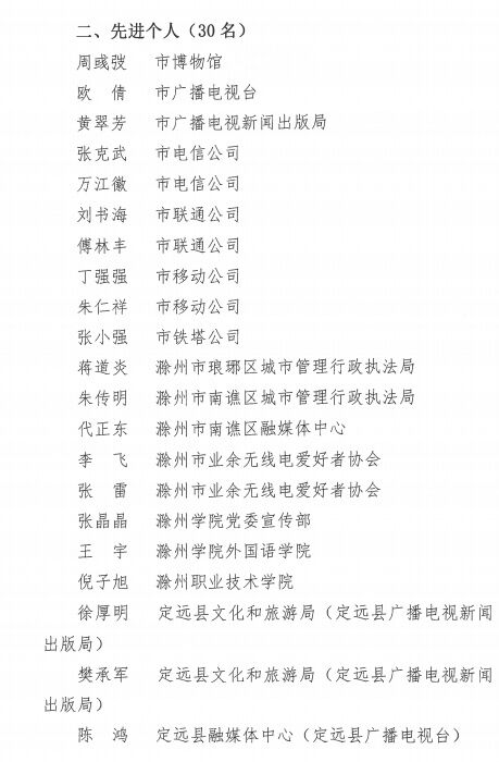 为发扬滁州市无线电管理成绩、激励工作,滁州无线电管理处对17个设台单位和30名先进个人予以通报表彰。其中,必威betway精装版app职工周彧弢被评为2020年度滁州市无线电管理先进个人。