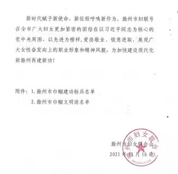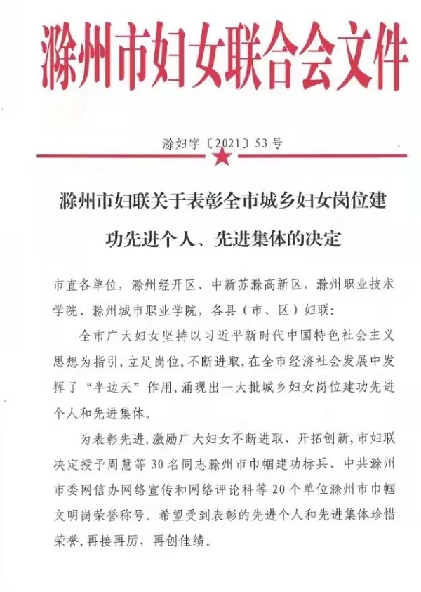 近日,滁州市妇女联合会对全市城乡妇女岗位建功先进个人、先进集体做出了表彰,我馆讲解员金辰辰荣获“滁州市巾帼建功标兵”称号。