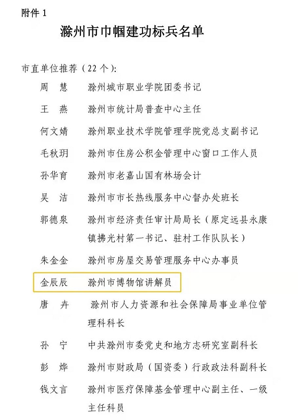 我馆讲解员金辰辰荣获 “滁州市巾帼建功标兵”称号