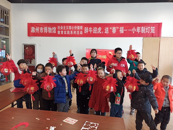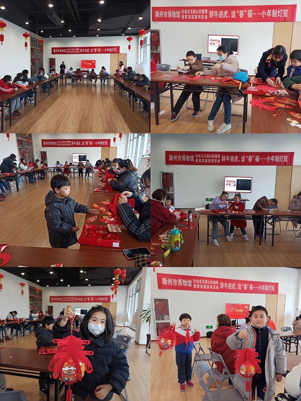 活动中,博物馆讲解员首先介绍了小年的民间习俗,带领小朋友们一起互动了手指谣,接着讲解了拼装春字灯笼的制作步骤及技巧。在认真听取讲解后,孩子们充分发挥动手能力,经过裁剪、固定、组装、粘贴等步骤,一盏盏象征着喜庆、祥和的灯笼便呈现在眼前。活动结束后,孩子们拿着自己亲手制作的灯笼合影留念,脸上都洋溢着幸福灿烂的笑容。