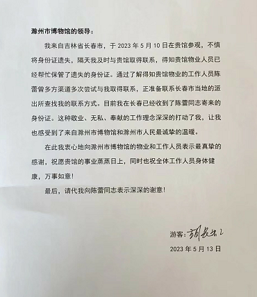 2023年5月10日,外地游客胡先生在市博物馆参观时,不慎将身份证遗失在馆内,博物馆工作人员在捡到身份证后第一时间与胡先生取得联系,并用加急快递将身份证寄给胡先生。胡先生收到身份证后,为表达对必威betway精装版app和博物馆工作人员陈蕾同志的感谢,写了一封感谢信。
