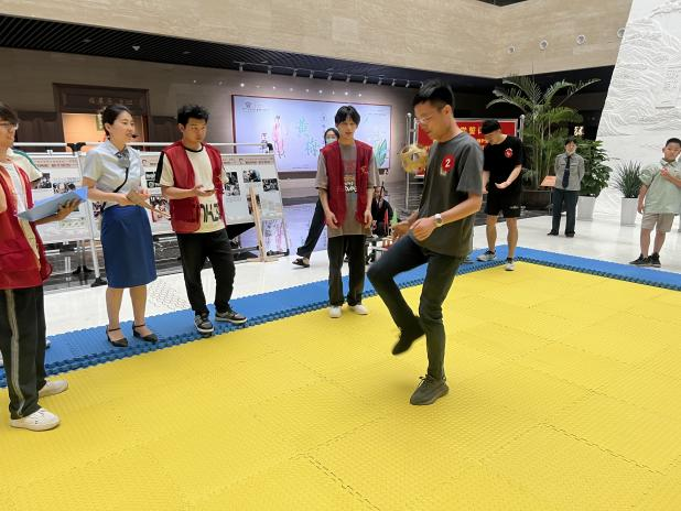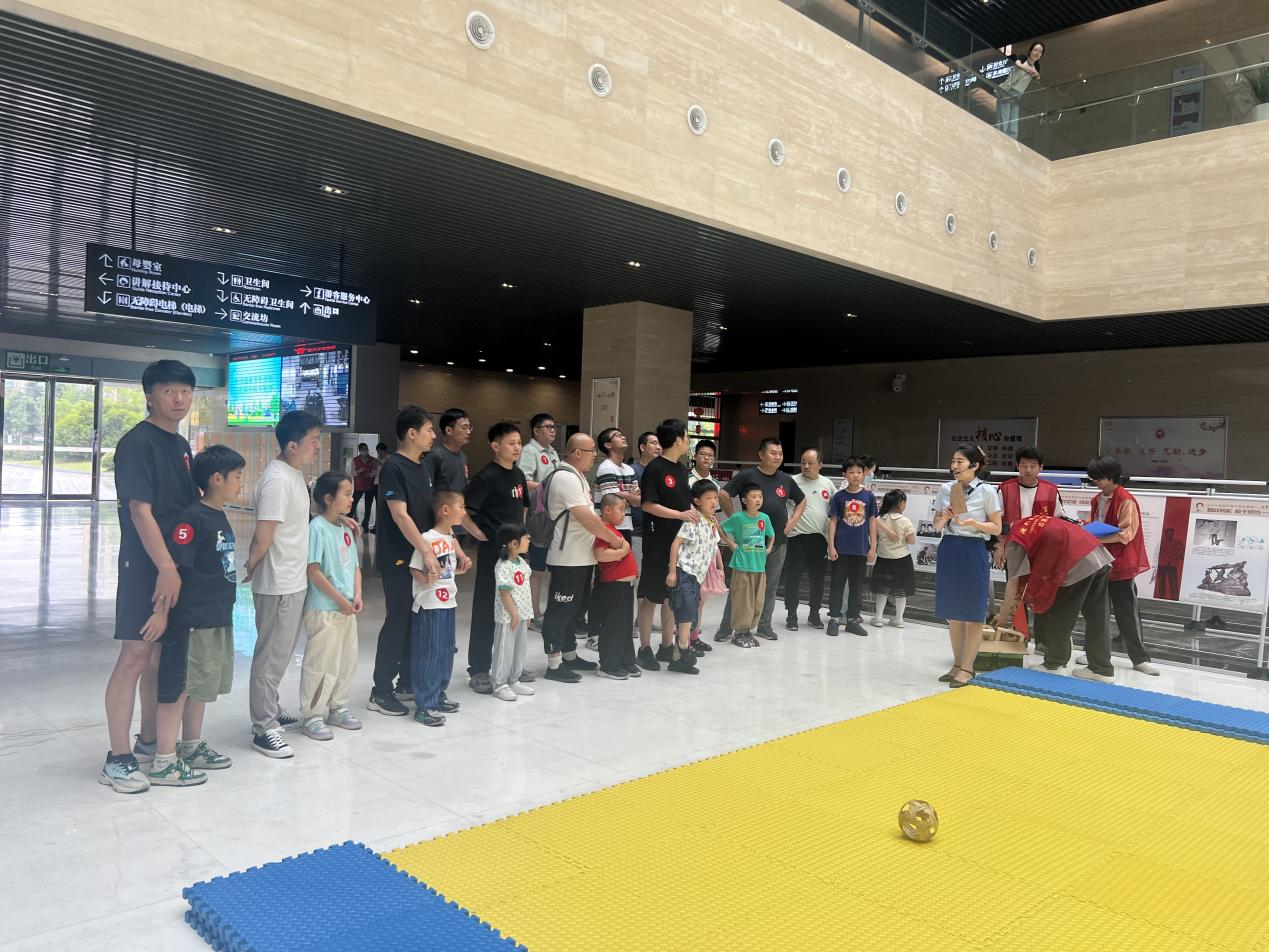 此次国潮运动会比赛项目设有投壶、捶丸、蹴鞠和木射。“射者中,弈者胜”,“踏鞠始于轩后,军中练武之剧”,“捶者打也,丸者球也”……每场比赛项目开始前,讲解员老师给大家介绍该项目起源的朝代、发展历史等相关知识,并说明游戏规则。爸爸和孩子相互配合,默契合作,整个大厅充满欢声笑语。最后的木射游戏将活动推向高潮,助威声震耳欲聋。