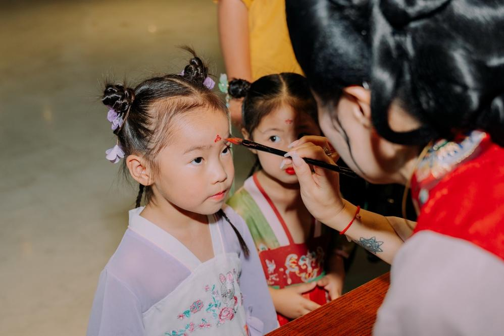 夜幕降临馆内便热闹了起来,身着汉服的小朋友们在爸爸妈妈的陪同下走进滁州博物馆,同样身着汉服的工作人员为他们“点朱砂”、“沐兰汤”和“系五彩绳”,寓意着身体健康、平平安安。