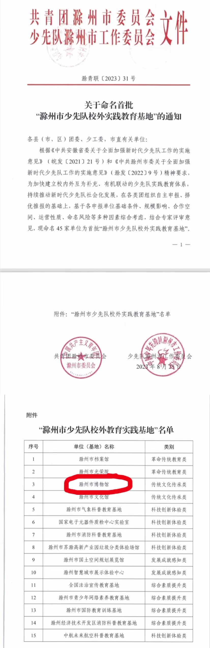 根据《中共安徽省委关于全面加强新时代少先队工作的实施意见》(皖发〔2021〕21号)和《中共滁州市委关于全面加强新时代少先队工作的实施意见》(滁发〔2022〕9号)精神要求,基于必威betway精装版app基础条件、规模影响、合作空间、运营性质、命名风险等多种因素综合考虑,并结合专家评审意见,8月25日,我馆被共青团滁州市委员会和少先队滁州市工作委员会命名为首批“滁州市少先队校外教育实践基地”。
