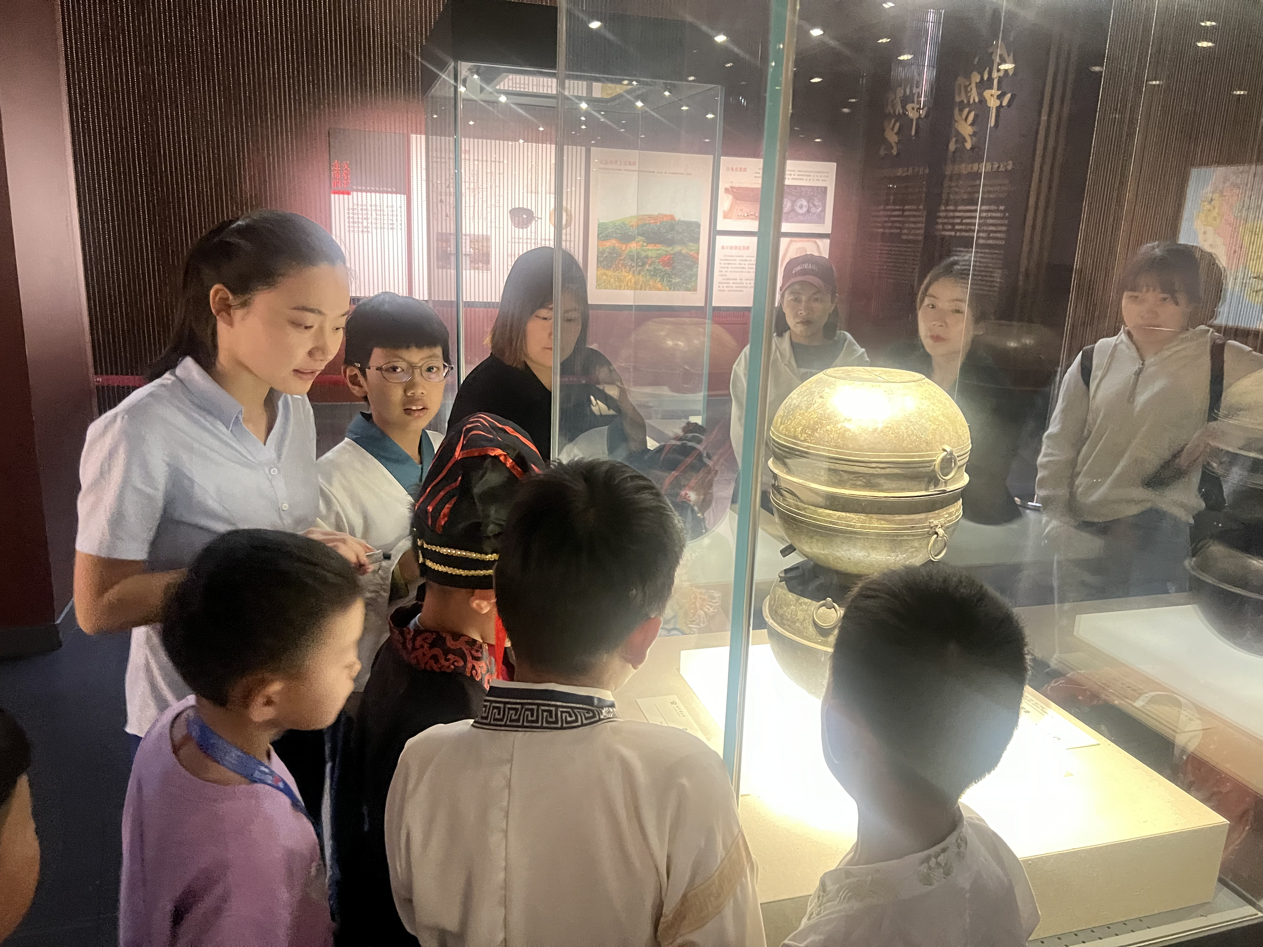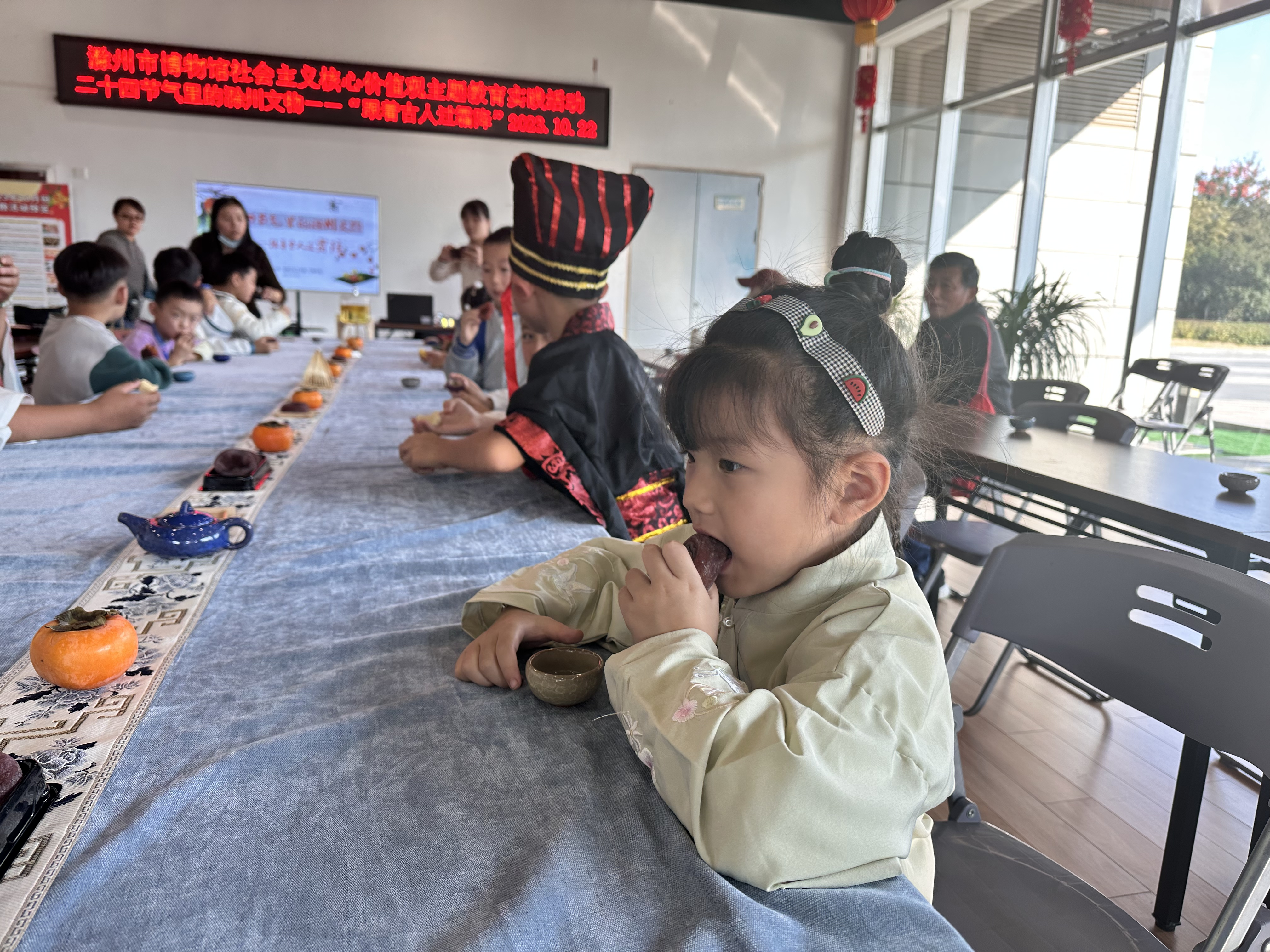 活动开始,许薇老师用内容丰富多彩的课件带小朋友们了解“霜降”的由来、气候变化以及“霜降”节气传统习俗,并开展了飞花令的小游戏,大家一边体验古人在霜降时节吃柿子、喝菊花茶的习俗,一边做游戏,不亦乐乎。最后讲解员丁老师带领大家走进二楼历史展厅,为大家介绍了博物馆的镇馆之宝“汉带流甗形器”,并打卡了“汉带流甗形器”印章。